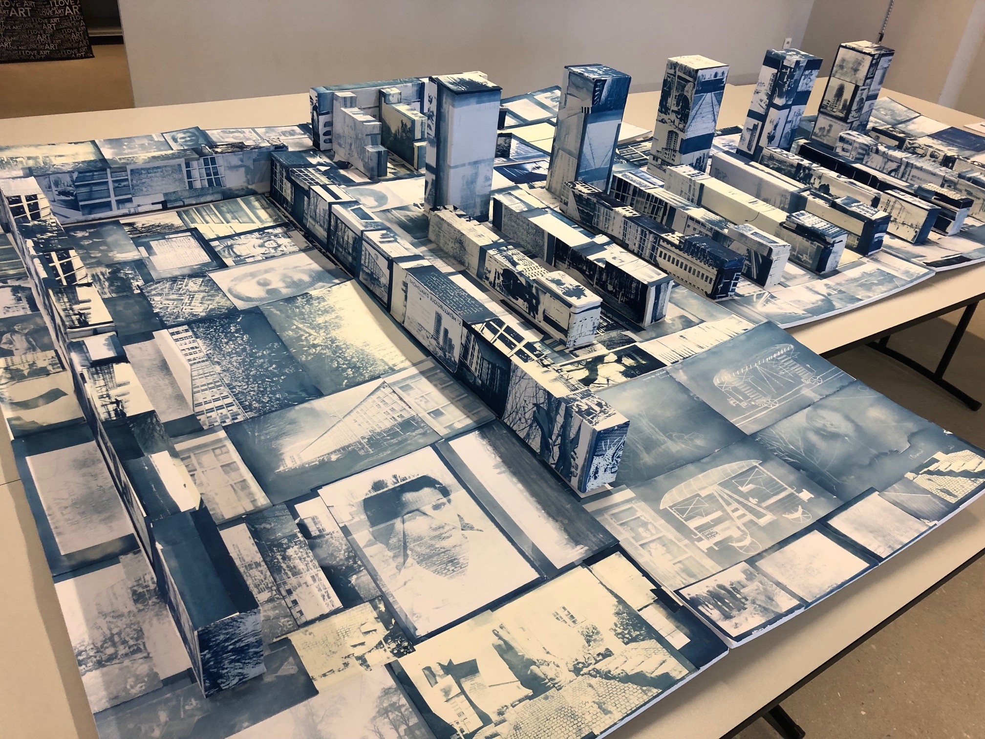 La maquette conçue par les élèves propose une exploration sensible et singulière de la Cité de la Muette. Construite dans les années 1930, la cité est d’abord la promesse d’un habitat social innovant. Elle devient camp d’internement et de transit durant la Seconde Guerre mondiale, et retrouve sa fonction initiale en accueillant de nouveaux locataires à partir de 1949. Archives, plans, cadastres, dessins, photographies sont réunis par l’impression au cyanotype et apposés sur la maquette comme autant d’images qui collent à la peau, ici aux murs, d’un lieu chargé de mémoires.